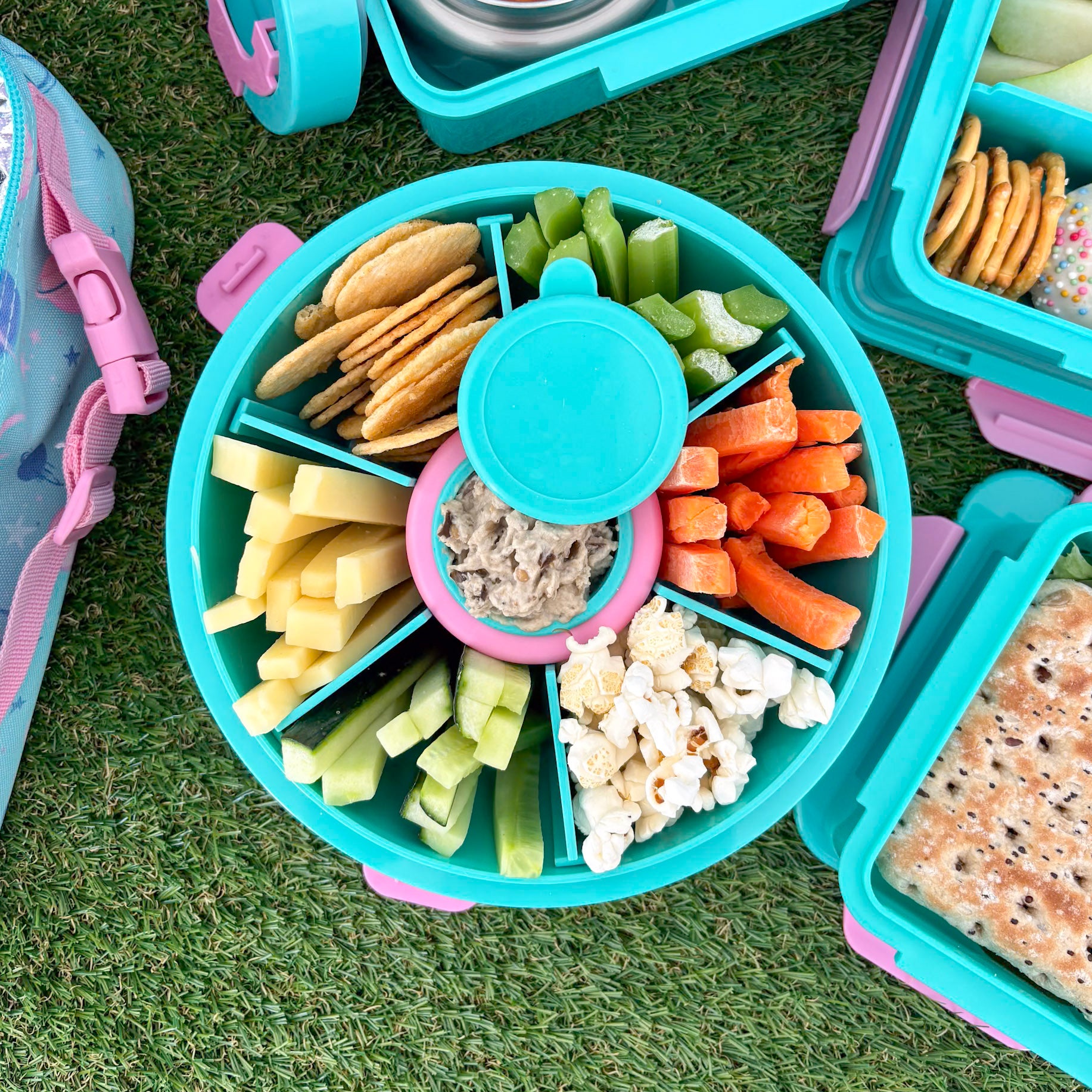 Meet the Spixal ROUNDIE, the 6 compartment bento lunch box with a centre dipping container.